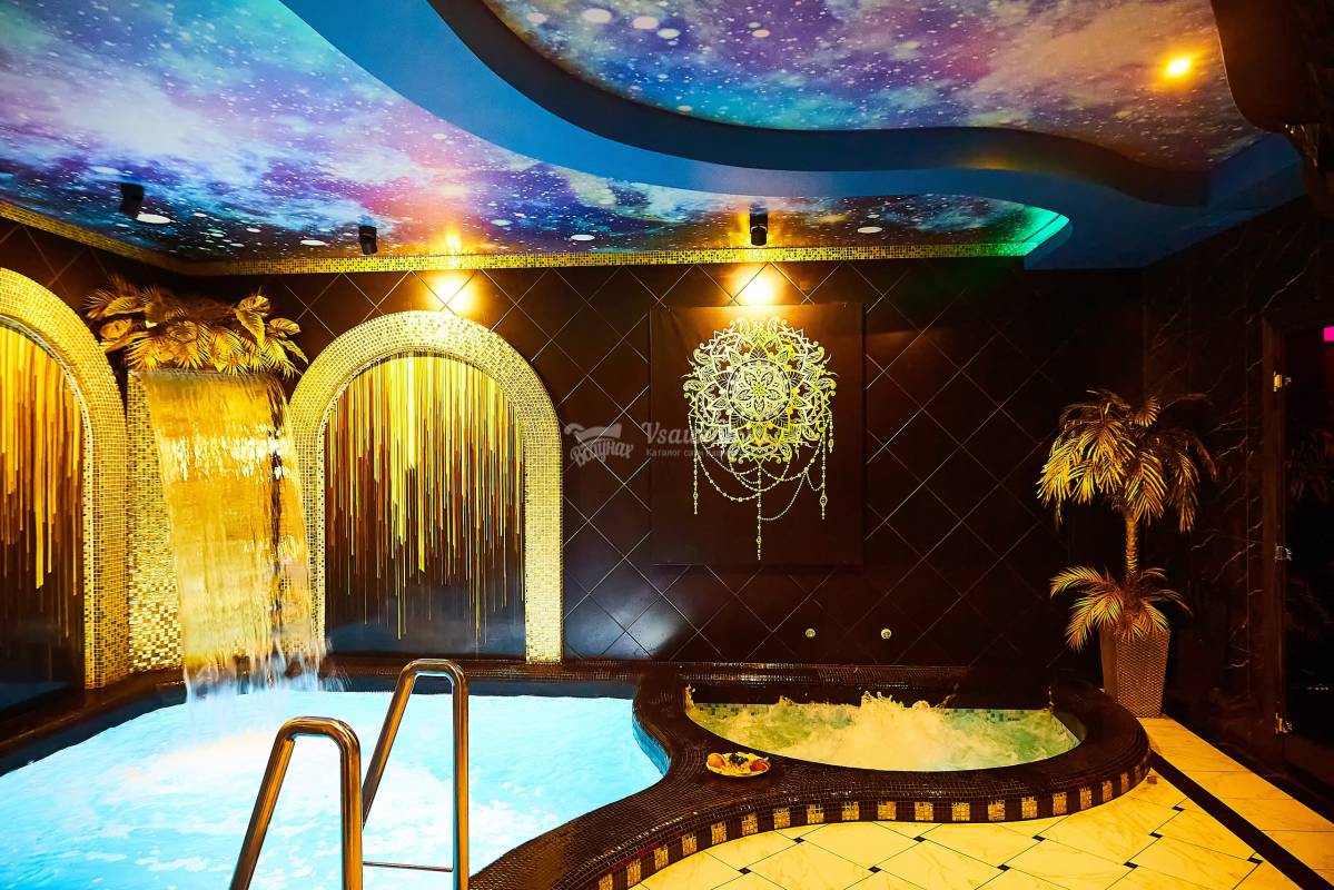 Посетители большого зала нашего БК смогут попариться в жаркой финской парной или турецком хаммаме, а также насладиться водными процедурами в бассейне с подсветкой воды и водопадом или джакузи с гейзером и различными режимами гидромассажа. Кроме того, в БК имеется отдельный зал для игры на бильярде, две уютные комнаты отдыха и просторная гостевая зона с мягкой мебелью и обеденным столом, массажным креслом, а также современной аудиосистемой, большим ТВ и караоке.